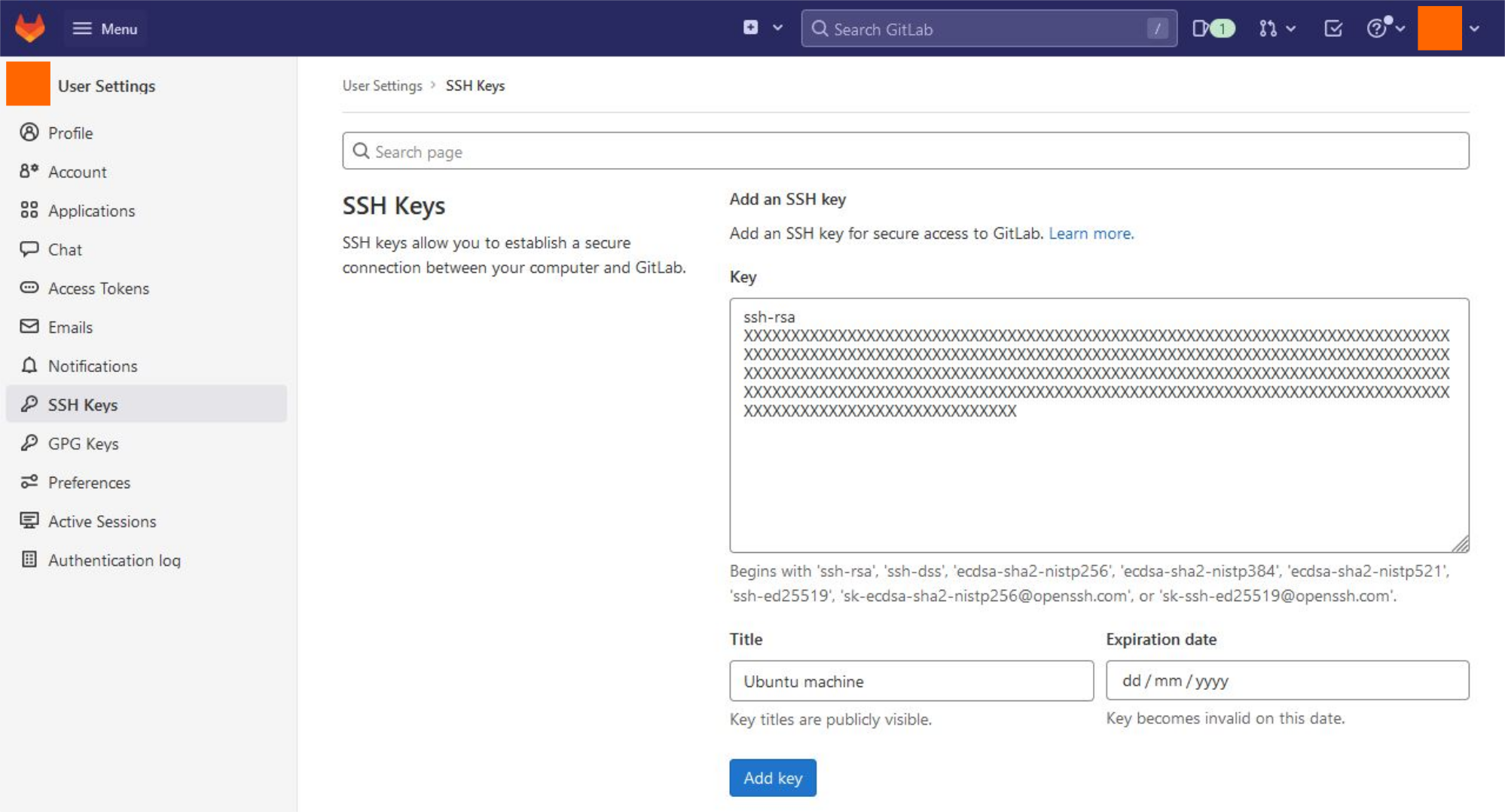 C:\Users\<YOUR_USER>\.ssh\id_rsa.pub. For Linux,/home/<YOUR_USER>/.ssh/id_edxxxxx.pubcontain your key. - Like in the figure below, add the generated key (all the content in .pub file) to ‘GitLab user settings > SSH Keys’.