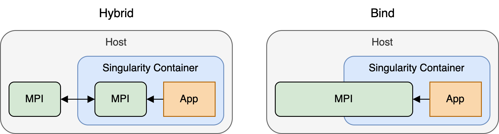 When it comes to integrating with MPI, two different approaches can be applied. The first approach is the ”Hybrid Model”, where MPI is installed in the container as well as the host system. When run, the MPI instance of the host will communicate with the MPI installation inside the container. The second approach is the ”Bind Model”, where the host’s MPI installation is mounted into the container. The latter approach is more performant as there is less communication overhead. However, the solution is less portable and therefore makes it harder to reproduce results as the container is not executable on its own anymore due to the lacking MPI installation.