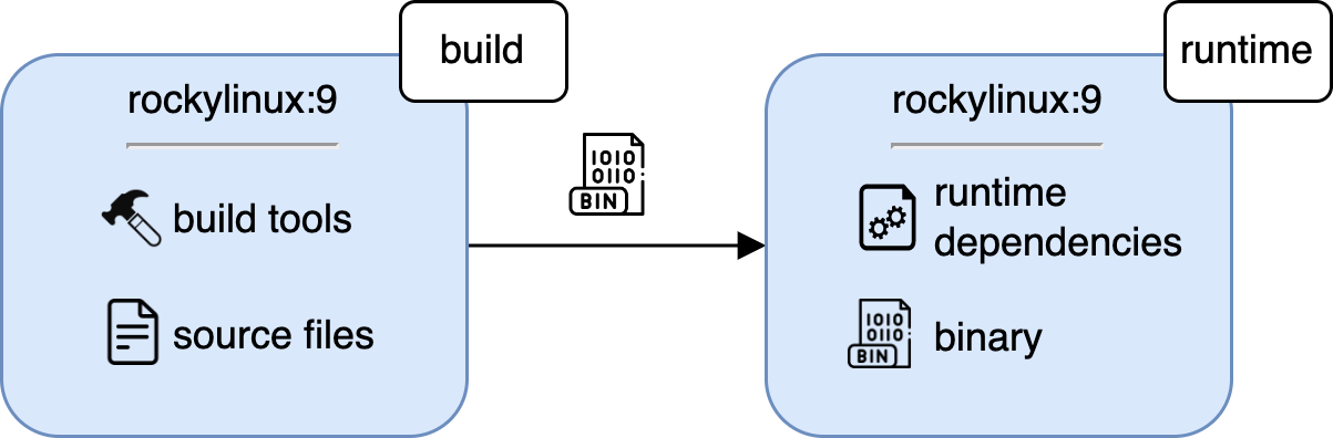 In the following, we demonstrate the image definition for a container using the MPI Bind Model. The definition file specifies two stages, build and runtime, with the base image rockylinux, which was used due to being the unofficial successor to the discontinued CentOS that runs on the HPC cluster used during testing. In the first section, build, we use the %files section to copy the source files of the example C++ application to the container file system. The following %post section installs the build dependencies and compiles the application in a build directory.
